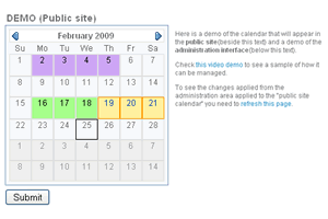 The Advanced Reservation Calendar is a Javascript-based calendar that can serve both to select bookable dates in a reservation form or to report on bookings made, including in any case an administration section which allows control of the calendar information and available / booked dates.
