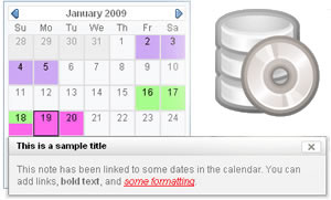 The ASP Event Calendar with Database is similar to ASP Event Calendar, with the difference that in this case the events are saved to and loaded from a database rather than an internal text file. Saving events in a database (eg. MSAccess) allows a deeper integration with other pages or services of your website, as well as inheriting data export facilities offered by databases.